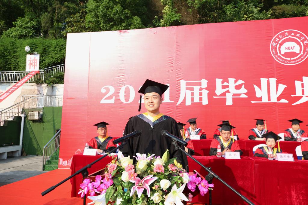 机械工程学院2021届本科毕业生陈烨作为毕业生代表发言。他说汽院,教会他在社会实践中学习;汽院,加深了他的家国情怀;汽院,坚定他天道酬勤的信念。汽院学子不仅是“造车人”,还是时代的造梦者,只要始终坚信,满怀希望,就会所向披靡!他代表毕业生感谢母校的培养,愿母校光辉历程更辉煌,愿各位老师身体健康,工作顺利,愿各位同学前程似锦!并呼喊出“奔跑吧,汽院人!”的口号。